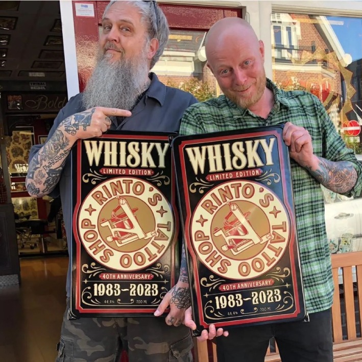 Pour célébrer le 40e anniversaire de Rinto's Tattooshop, une magnifique étiquette de whisky a été conçue et une ligne de whisky limitée de 100 bouteilles a été produite. À partir de cette incroyable étiquette vintage, nous avons eu l'occasion de créer deux panneaux en émail, qui ont été fabriqués presque entièrement selon les techniques de pochoir traditionnelles. Les panneaux sont réalisés dans le modèle nostalgique bien connu en "oreille", où les bords sont repliés et chaque coin est équipé d'une "oreille" contenant le trou de vis.