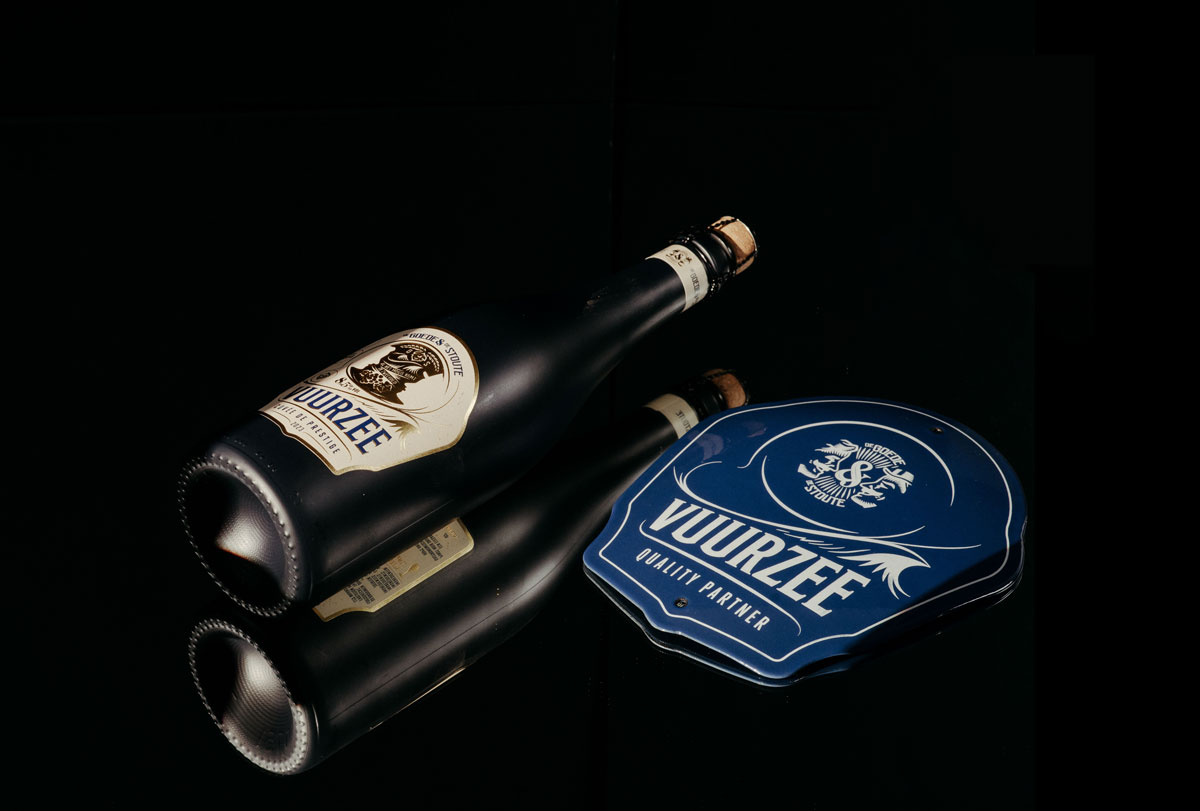 Vuurzee, un mélange élégant entre la bière et le Champagne avec l'ajout de l'écorce d'un Pinot Noir. Une boisson de ce niveau mérite naturellement une magnifique enseigne en émail pour ses "Partenaires de qualité". Chez Goede & Stoute, ils savent clairement comment se démarquer.